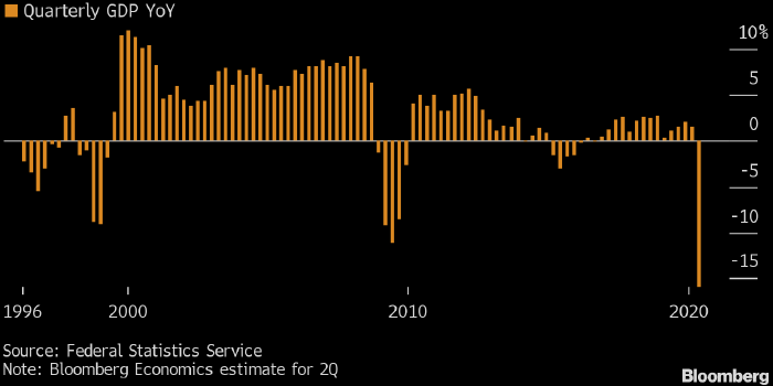 Таким образом, ВВП России во втором квартале может сократиться на 16% г/г (см. график в начале статьи — прим. ProFinance.ru), что станет наиболее глубоким спадом с начала 1990-х годов, прогнозируют эксперты Bloomberg Economics.