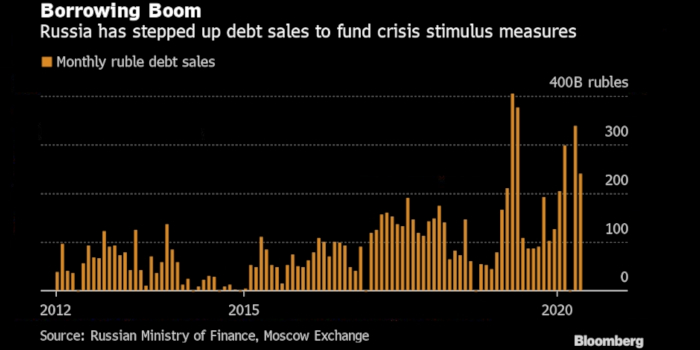 Минфин разместил облигации на 112 миллиардов рублей со сроком погашения в октябре 2027 года (1,6 миллиарда долларов) на своем первом аукционе в среду. Заявки на покупку достигли 149 млрд рублей, поскольку перспектива более глубокого сокращения процентных ставок поддержала спрос, в то время как местные банки, возможно, покупали госдолг, чтобы использовать его в качестве обеспечения на аукционах долгосрочного репо с центральным банком. Россия имеет одну из самых низких долговых нагрузок в мире, поэтому у нее много возможностей для увеличения заимствований. Восстановление цен на нефть также помогло повысить спрос на облигации.