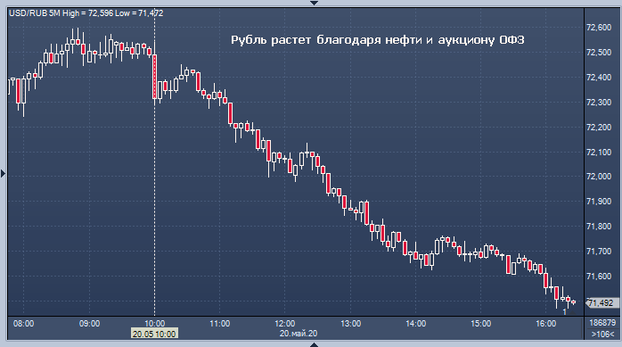 Российский рубль растет третий день, демонстрируя самую длинную победную серию в этом месяце, чему способствует дорогая нефть и успешный аукцион размещения государственных облигаций Минфином. Россия присоединяется к целому ряду стран, который поспешили воспользоваться рекордно низкой стоимостью заимствований, установив рекорд продажи облигаций. Россия использовала исторически низкие затраты по займам для финансирования своих планов стимулирования экономики, продав большую часть запланированного долга на аукционе в среду.