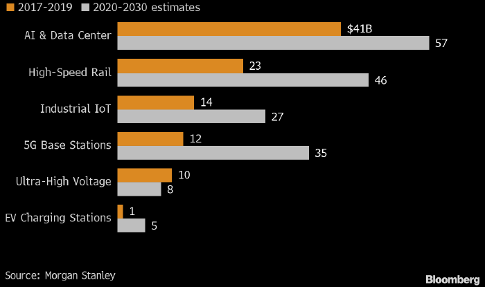 Отдельные расчеты Morgan Stanley предполагают, что в ближайшие 11 лет Китай будет ежегодно вкладывать в новую инфраструктуру около $180 млрд (эти цифры включают в себя расходы на строительство линий сверхвысокого напряжения и высокоскоростной железной дороги). Таким образом, ежегодные инфраструктурные расходы вырастут почти вдвое относительно их средней величины в последние три года (график в начале статьи отражает данные по инвестициям Китая в разные сектора экономики в 2017-2019 годах (оранжевым) и аналогичный прогноз Morgan Stanley на 2020-2030 годы (серым) в миллиардах долларов — прим. ProFinance.ru). Среди главных бенефициаров новой инфраструктурной программы банк называет China Tower., Alibaba, GDS Holdings, Quanta Computer и Advantech.