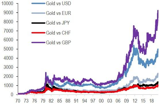 По их мнению, подобный фон как минимум частично объясняет недавний взлет цен на золото, которое уже достигло или приближается к историческим максимумам против целого ряда валют, включая евро, иену, фунт, франк и доллар (см. график ниже — прим. ProFinance.ru).