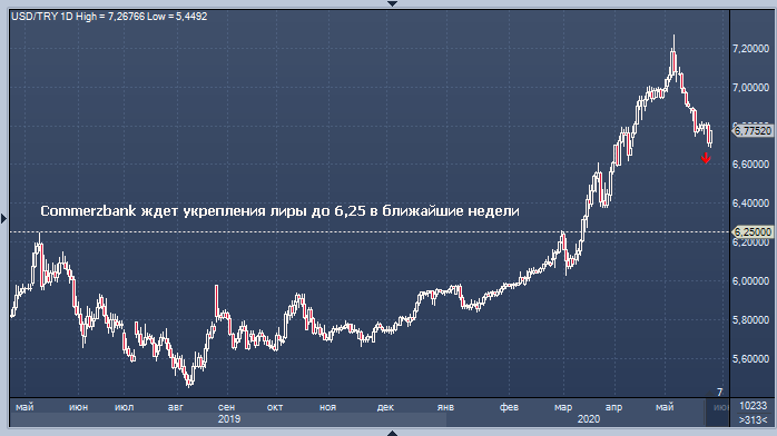 Прогноз турецкой лиры зависит от того, насколько быстро восстановится экспорт страны в связи с ослаблением карантинных ограничений по всей Европе, отмечает Commerzbank.