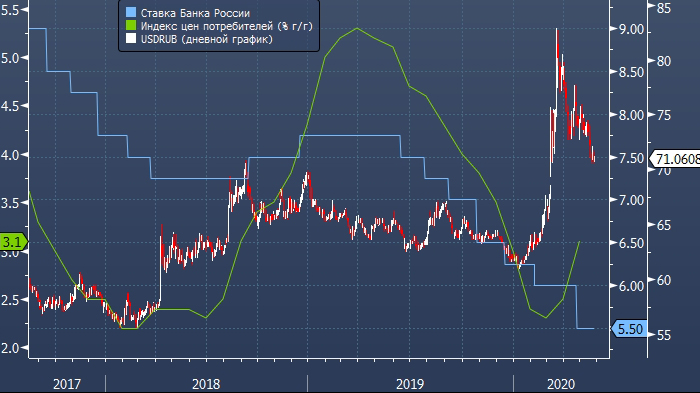 В Альфа-Банке полагают, что резкое ухудшение ситуации в экономике заставит Банк России на заседании 19 июня пойти на снижение ставки сразу на 75 базисных пункта – c 5.50 до 4.25%. Уровень безработицы в России в апреле вырос с 4.7% до 5.8%, и эксперты считают, что это указывает на то, что многие россияне находятся в неоплачиваемых отпусках. В то же время падение розничных продаж в прошлом месяце составило 23.4% г/г при прогнозе в -17.7% г/г, то есть негативных эффект пандемии была даже сильнее, чем в Китае, где продажи в феврале упали на 21%, и США, где розничная торговля сократилась на 16% г/г в апреле. В Альфа-Банке также отмечают, что падение потребления электроэнергии в России в мае на 5% г/г говорит о спаде промышленного производства, и сообщают о снижении прогноза по ВВП страны на этот году до -3% г/г.