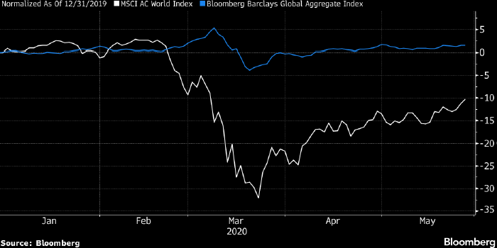 Несмотря на недавний отскок, большинство мировых фондовых индексов остается в минусе по итогам 2020 года, и сводный индикатор MSCI All-Country World Index находится примерно на 10% ниже уровней начала января. Суверенные облигации при этом показали относительно лучшую динамику, особенно там, где в происходящее вмешались центробанки (график выше отражает процентное изменение фондового индекса MSCI All-Country World (белым) и глобального индекса облигаций Barclays (синим) с начала года – прим. ProFinance.ru).