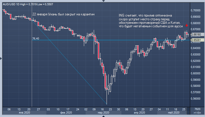 В банке обращают внимание на то, что драйвером улучшения динамики аусси стали надежды на позитивный эффект снятия карантинных ограничений в ряде ключевых экономик и рост цен на сырьё, однако на смену страху перед пандемией приходит беспокойство относительно нового витка эскалации отношений между США и Китаем. Учитывая, что Австралия идёт в фарватере американской политики, а экономически сильно зависит от Китая, её позиции выглядят весьма уязвимыми.