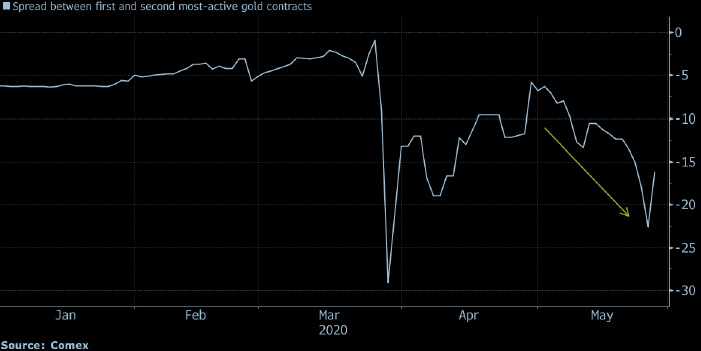 Совсем недавно июньские фьючерсы на золото торговались на $20 ниже августовских (см. график в начале статьи — прим. ProFinance.ru), тогда как в середине апреля на рынке наблюдалась заметная бэквордация. Июньский фьючерс торгуется и дешевле спота, хотя в середине мая премия достигала $12 за унцию, а в марте — и вовсе $60 за унцию.