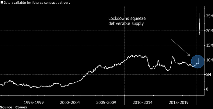 Пандемия коронавируса нарушила международное авиасообщение и заставила инвесторов волноваться о том, сможет ли золото попасть в хранилища COMEX в Нью-Йорке для поставки по фьючерсным контрактам. Спустя какое-то время в США хлынул поток драгметалла со всего мира, и теперь покупатели фьючерсов всеми силами пытаются избежать поставки.