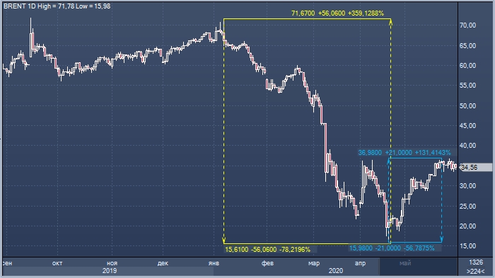 И если фьючерсы на американскую нефть WTI впервые в истории упали ранее в зону отрицательных значений, когда продавец приплачивал покупателю за то, что тот заберет с поставкой объем «черного золота», то к концу мая WTI торговалась чуть ниже $35 за баррель.