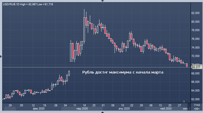 Рубль укрепился на первых летних торгах и сходу же преодолел психологический уровень в 70 рублей за доллар за счет дальнейшего подъема цен на нефть до максимумов за три месяца и ослабления доллара США на форексе на фоне всплеска надежд на возврат мировой экономики в рабочее русло и отсутствия жесткой реакции Вашингтона на политику Пекина в отношении Гонконга.
