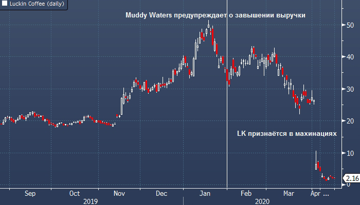 Стоит отметить, что еще в конце января Muddy Waters LLC, американская компания, специализирующаяся на продажах переоценённых акций и имеющая опыт в раскрытии финансовых махинаций китайских компаний, опубликовала тревожны отчёт. В нём она со ссылкой на анализ 11 000 часов видео трафика магазинов, 25 000 чеков клиентов и опрос 1500 человек, посещавших точки продаж Luckin Coffee, сообщила о том, что большая часть выручки кофейного бизнеса была сфабрикована. Однако тогда опровержения со стороны компании оказалось достаточно, чтобы инвесторы отказались снять розовые очки.