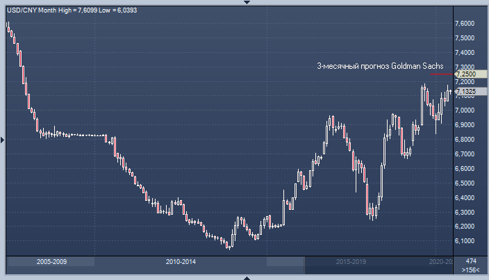 Валютные стратеги Goldman Sachs полагают, что юань продолжит слабеть и очень скоро достигнет уровней, которые не наблюдались с 2008 года. В банке повысили прогноз по USDCNY на три месяца с 7.15 до 7.25, шестимесячный прогноз был повышен с 7.05 до 7.15, а однолетний — с 6.90 до 7.00.