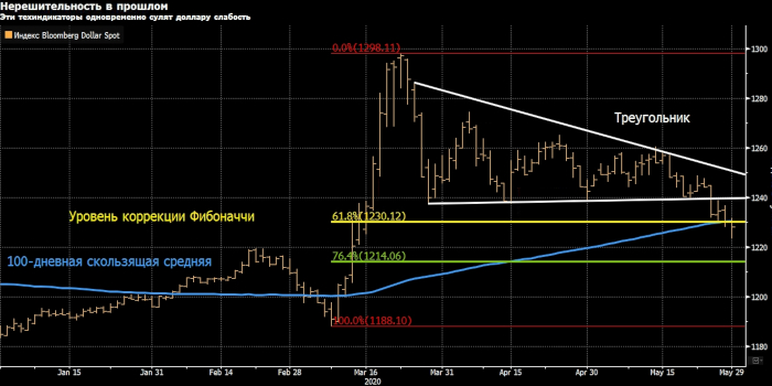 Сильное падение доллара указывает на переломный момент для более рискованных активов, особенно валют развивающихся рынков, и возможность устойчивого роста. Bloomberg Dollar Spot Index пробил вниз модель нисходящего треугольника. Это знак того, что медведи выигрывают в перетягивании каната, которое длилось более двух месяцев. Индикатор также упал до уровня 61.8% Фибоначчи и теперь находится ниже 100-дневной скользящей средней, впервые с конца марта.