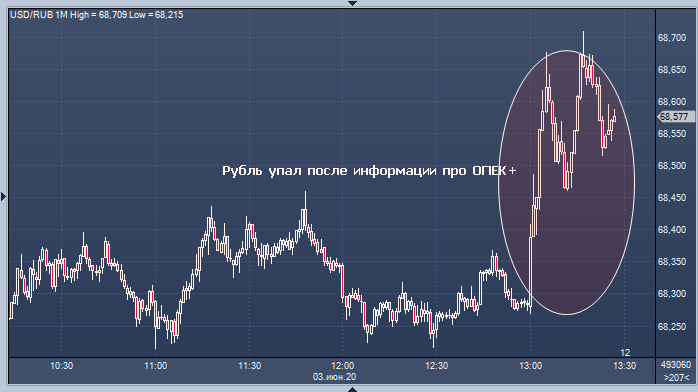 Курс рубля упал с уровня 68.26 до почти 68.80. Фьючерс на индекс РТС с экспирацией в июне упал с уровня 129 500 до уровня 127 500.