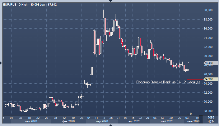 Аналитики Danske Bank отмечают, что улучшение ситуации на финансовых рынках в последние недели создало благоприятную почву для укрепления рубля. Они полагают, что рост российской валюты в обозримом будущем может продолжиться, и прогнозируют снижение EURRUB до 74.9 в перспективе 6 и 12 месяцев.