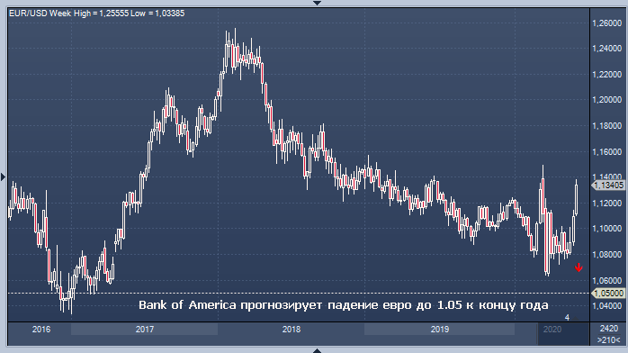 Bank of America по-прежнему ожидает, что к концу года евро упадет до 1,05 доллара, так как настроения на рынке ухудшатся, что укрепит доллар, считающийся активом безопасного убежища.