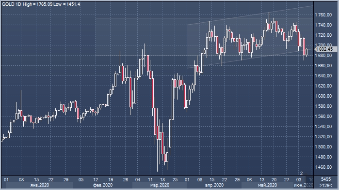 С начала 2020 г. золото на спот-рынке подорожало на 12%. В понедельник, 8 июня, золото утром растет в цене на 0,5% до 1692,96 за унцию.