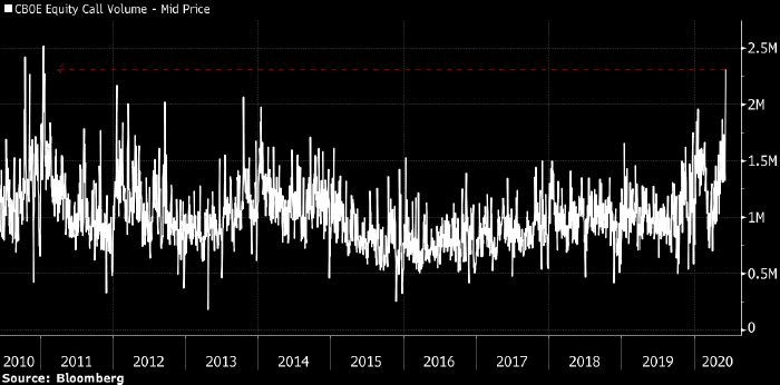 Резкий рост рынка акций США усилил активность розничных спекулянтов на рынке опционов. В четверг объем торгов кол-опционами на акции отдельных эмитентов составил 2.3 млн контрактов, что стало рекордным значением с 2011 года (см. график в начале статьи — прим. ProFinance.ru), пишет Bloomberg со ссылкой на данные CBOE.