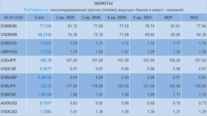 В целом можно отчетливо увидеть, что наблюдаемое в последние дни давление на доллар совершено не отражено в консенсус-ожиданиях. Если взять в моменте курс доллара к рублю или к евро, то по прогнозам такие цифры должны быть предстоящей зимой. Можно прийти к выводу, что сейчас доллар излишне перепродан и начнет восстанавливать позиции во втором полугодии, которое может принести целый список рисковых факторов, например, результат президентских выборов в США, вторая волна коронавируса осенью, Brexit без торгового соглашения между Великобританией и ЕС.