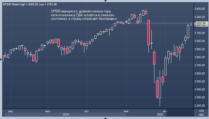Индекс S&P500 в ходе торгов на прошлой неделе вернулся к уровням, на которых он начинал прошлый год, а индекс Nasdaq завершил её на новых рекордных максимумах, прибавив более 10% с начала января. Подобные впечатляющие результаты были достигнуты на фоне по-прежнему слабых экономических данных из США, где продолжают полыхать протесты, и эксперты отмечают, что рынок, кажется, опять впал в крайность.