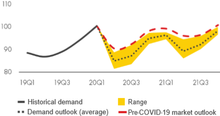 В 2019 году мировое потребление СПГ выросло на рекордные 13% и составило 359 млн тонн (график выше отражает динамику спроса на СПГ (синяя сплошная линия), текущий прогноз (синие точки) и докоронавирусный прогноз (красный пунктир). Все в млн тонн — прим. ProFinance.ru).