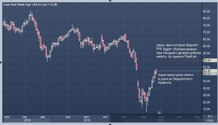 Рост цен на нефть дал повод для разговоров о скором завершении продаж валюты Банком России, однако в Ренессанс Капитале призывают не забывать, что внесение вклада в улучшение обстановки на рынке «чёрного золота» стоило России 2.5 млн баррелей в сутки. Столь значительное снижение добычи, которое было продлено в этом месяце, означает падение нефтегазовых доходов бюджета приблизительно на 10%, а это означает, что его сбалансированности не добиться при цене Urals в $42 за баррель. В Ренессанс Капитале отмечают, что сокращение выручки может быть компенсировано ростом цен еще на $8 за баррель, так что цена нефти, при которой ЦБ РФ прекратит продавать иностранную валюту составляет $50 за баррель. Пока нефть не доберется к уровням выше этой отметки, снижение валютных резервов России, вероятно, продолжится.