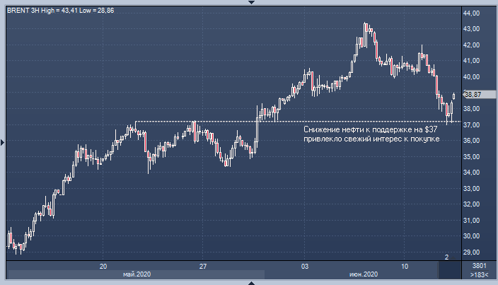 Нефть марки брент начала день с падения к свежим минимумам в районе $37 — прогнозы ФРС и новости о рекордном уровне запасов в США несколько охладили оптимизм инвесторов, равно как и опасения относительно начала второй волны заболеваний коронавирусом в США. Однако оптимизм не угас, и движение привлекло свежий интерес к покупке — в настоящее время быки уже штурмуют офера на подходе к $39.