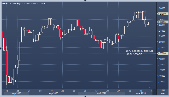 В CA напоминают, что 18-19 июня пройдёт саммит ЕС, где, в том числе, будет обсуждаться вопрос о забуксовавших переговорах по Брекзиту. Прогресс выглядит маловероятным, и в банке ожидают переоценки рисков выхода Великобритании без торговой сделки. Также 18 июня пройдет заседание Банка Англии, от которого можно ожидать увеличение масштабов программы количественного ослабления и, возможно, дискуссии о негативных ставках. На этом фоне неприятные сюрпризы со стороны данных по рынку труда, инфляции и розничным продажам могут усилить рост негативных настроений. Кроме того, вероятно, что в краткосрочной перспективе охлаждение оптимизма относительно восстановления мировой экономики продолжится – повод для этого дают новости о новых всплесках заболеваний COVID-19.