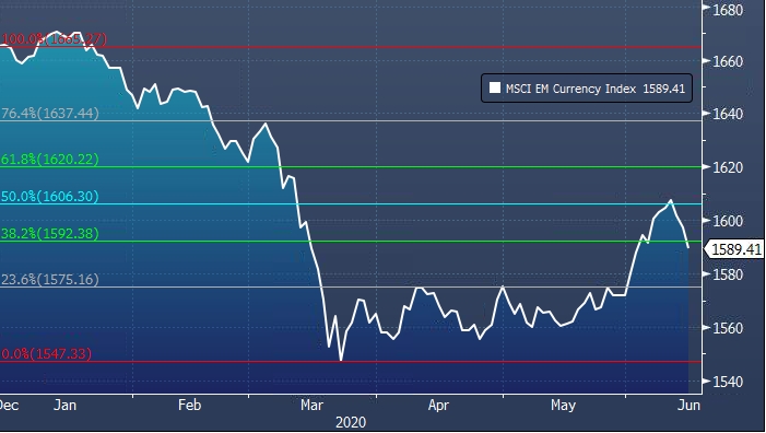 Индекс MSCI валют развивающихся стран на прошлой неделе отыграл 50% от просадки с начала года. Однако во второй половине недели выросли опасения в отношении риска второй волны распространения коронавируса в США, рынки акций упали, вырос спрос на безопасные активы. Поэтому индекс MSCI EM Currency Index не смог пробиться выше уровня Фибоначчи 50%.