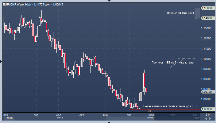 Восстановление аппетита к риску помогло Швейцарскому национальному банку защитить отметку в 1.05 в EURCHF — последняя стала новой красной линией для регулятора. Однако рост EURCHF оказался непродолжительным, и в последние дни франк демонстрирует попытки вернуться к барьеру. В SEB отмечают, что в свете признаков формирования новой волны заболевания COVID-19 швейцарская валюта продолжает привлекать искателей тихой гавани, при этом положительным для неё фактором также является конструктивная фундаментальная картина. В банке, однако, полагают, что у ШНБ достаточно возможностей для защиты франка от избыточного укрепления, а в ближайшие месяцы у инвесторов будет больше ясности относительно процесса восстановления экономики. В SEB полагают, что в этих условиях от EURCHF можно ожидать роста к 1.09 и 1.10 в третьем и четвертом кварталах, тогда как в следующем году в банке рассчитывают на возвращение пары к 1.14/1.15 на фоне улучшения обстановки в мировой экономике.