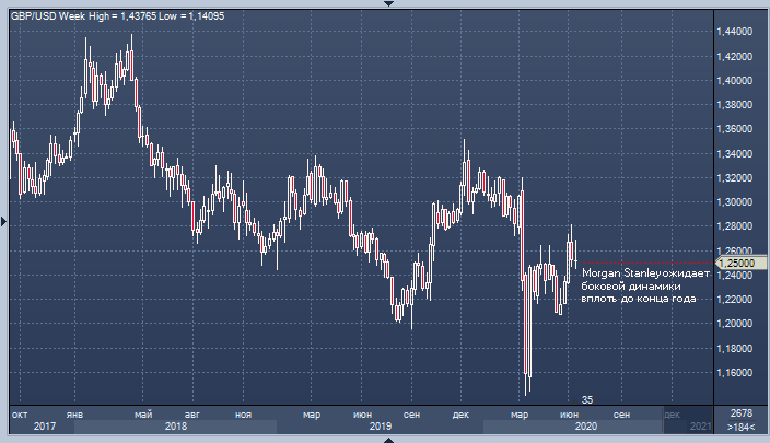 Morgan Stanley ожидает, что в течение этого года GBPUSD продолжит движение в боковом диапазоне – политика Банка Англии и неопределенность в вопросе Брекзита, который, судя по всему, так и не произойдёт в этом году, компенсирует ослабление доллара. Прогноз банка на третий и четвертый кварталы составляет 1.25, а в первом квартале 2021 он предрекает снижение курса к 1.22.