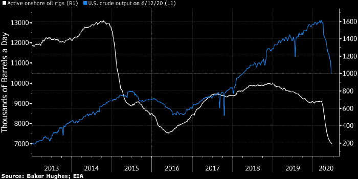 В предыдущий отчетный период (на неделе до 12 июня) число активных нефтяных буровых в США опустилось ниже 200 штук впервые за последние 10 с лишним лет (график выше отражает число активных нефтяных буровых в США (белым) и объем добычи сырой нефти в США (голубым) — прим. ProFinance.ru).