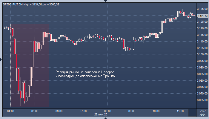 В ночь с понедельника на вторник торговый советник Белого Дома Питер Наварро внезапно сообщил о разрыве торговой сделки между США и Китаем, выступая в эфире телеканала Fox. Позже его словам опроверг Дональд Трамп, а сам Питер Наварро сказал, что его слова были вырваны из контекста, однако рискованные активы отреагировали на них резким снижением. Нефть Brеnt подешевела на 2.5%, фьючерсы на S&P 500 снизились на 2%, а золото, японская иена и другие защитные активы подорожали.