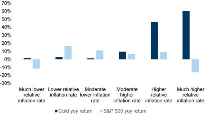 В любом случае, золото является полезным дополнением к любому портфелю в периоды высокой инфляции. Мы изучили различные инфляционные периоды и обнаружили, что золото обычно показывает лучшую динамику, чем рынок акций, в периоды высокой инфляции и умеренной дефляции. А рынок акций выглядит более привлекательным в периоды умеренной инфляции (см. график ниже - прим. ProFinance.ru).