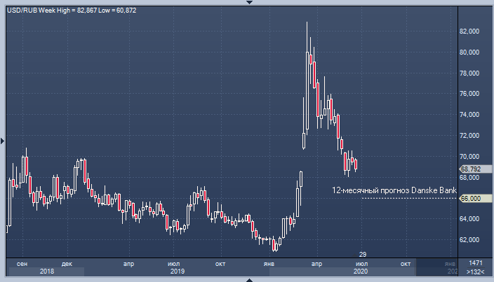 Стратеги Danske Bank считают, что при сохранении сложившейся на рынке атмосферы рубль может продолжить рост, однако ожидают, что он будет носить постепенный характер. Банк придерживается прогноза по USDRUB на уровне 69 на 1 месяц, на уровне 68 на 3 месяца. Прогноз на 12 месяцев был снижен с 70 до 66 рублей.