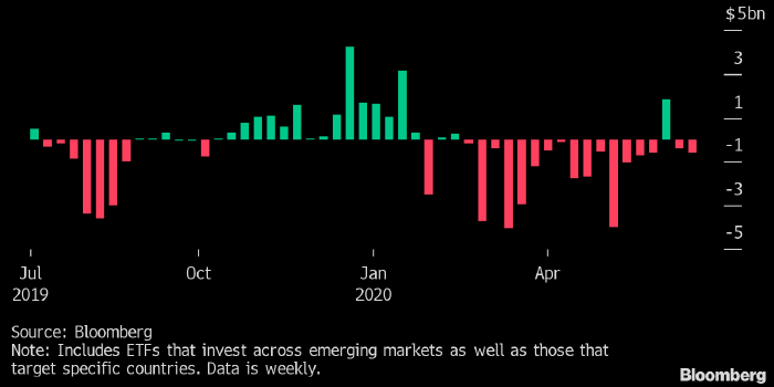 Биржевые фонды акций EM зафиксировали чистый отток капитала объемом $504 млн, а аналогичные фонды облигаций — чистый отток объемом $120.2 млн.