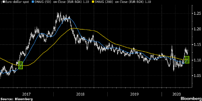 Евро/доллар (вес единой валюты в различных индексах доллара составляет около одной трети) вот-вот сформирует так называемый «золотой крест», когда 50-дневная МА пересекает снизу вверх 200-дневную МА, и тем самым подаст сильный технический сигнал на покупку (см. график ниже — прим. ProFinance.ru). В последний раз это произошло в 2017 году на фоне снижения рисков распада Еврозоны, и тогда евро/доллар за несколько месяцев вырос на 15 фигур.