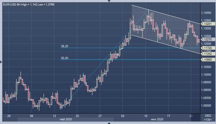 В сложившейся атмосфере в EURUSD под прицелом остаётся поддержка в районе 1.1172/67 (38.2% от роста с 14 мая и минимум 22 июня), прорыв ниже которой откроет дорогу развитию коррекции к нижней границе канала последних пары недель около 1.1134, а возможно и ниже. Впрочем, многие эксперты придерживаются мнения, что потенциал снижения пары выглядит ограниченным — новый приступ резкого и значительного укрепления американской валюты выглядит маловероятным. Так, покупать EURUSD на снижении рекомендуют аналитики Citi и Morgan Stanley — они предрекают рост курса 1.20, при этом последние видят шансы на рост и до 1.26 при материализации благоприятного сценария восстановления экономики.