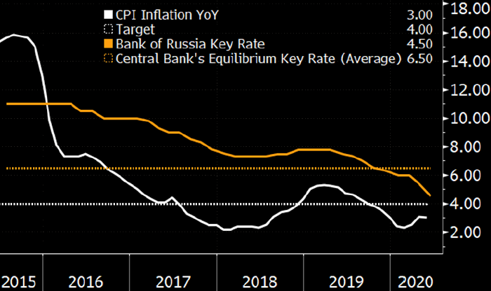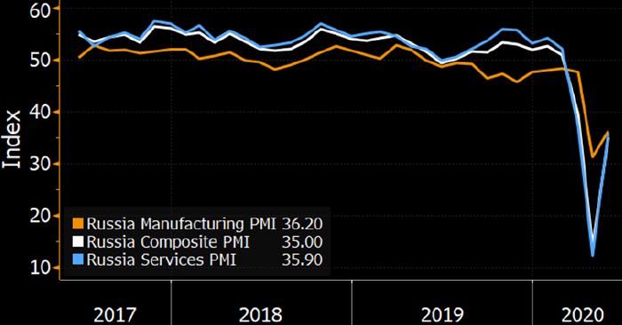 Россия находится в глубокой рецессии и продолжает ощущать на себе негативные последствия пандемии коронавируса и обвала цен на нефть, пишет Bloomberg Intelligence. Однако появляются признаки того, что реальный ущерб, который экономика страны понесла в связи с этими событиями, окажется меньше первоначальных прогнозов. Цены на нефть и курс рубля отыграли значительную часть потерь, что создает предпосылки для более масштабного стимулирования и агрессивного снижения ставок. Власти РФ обещают и то, и другое.