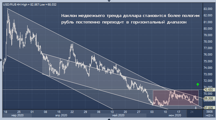 В общем теханализ готов лечь в канву фундаментального, а рубль готов развернуть вниз. Еще раз взглянем на график и можно сказать, что критической на данный момент будет линия в районе 70.60.