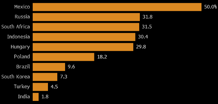 К настоящему моменту доля иностранцев на рынке локальных бондов Турции достигла рекордно низкого значения за всю историю, а в Польше — опустилась до 10-летнего минимума. Отток иностранного капитала с рынка локальных бондов Мексики в этом квартале может оказаться рекордным и превысить $7 млрд, а доля иностранцев на рынке локального госдолга Индии в этом году сократилась почти наполовину.