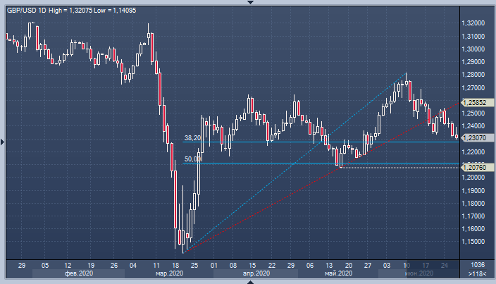 Благоприятными для медведей по фунту были и последние изменения в технической картине: линия тренда с марта была пробита, а попытка вернуться выше обернулась провалом. В фокусе теперь находится поддержка в районе 1.2275 (38.2% от роста с марта), прорыв ниже откроет дорогу к минимуму 18 мая в районе 1.2076.