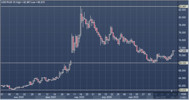 Курс доллар/рубль во вторник поднимался до 71,34, закрывшись на самом высоком уровне за месяц. Глава управления валютных операций МТС-Банка Олег Кочетков предположил, что слабость рубля была обусловлена внутренними факторами, а именно выходным днем в середине рабочей недели. Покупателей валюты прибавилось, а продавцов валюты стало меньше из-за сокращения рисков, объяснил эксперт. Давление на курс рубля во вторник оказывало 4 фактора, отметил начальник отдела глобальных исследований «Открытие Брокер» Михаил Шульгин, выделив снижение внешнего аппетита к риску, снижение цен на нефть, пониженную ликвидность перед нерабочим днем в России в среду, а, также технический спрос на доллар, обусловленный последним торговым днем июня, квартала, полугодия.