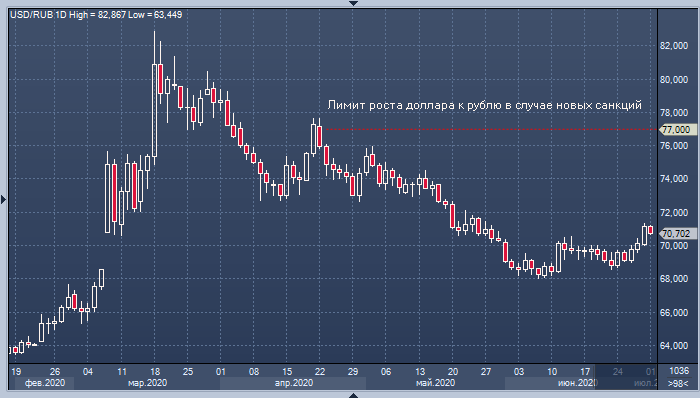 Эксперт полагает, что максимально возможный рост курса доллара к рублю в случае введения санкций составит около 10% (7 рублей за доллар), однако саму вероятность введения санкций он не оценивает.