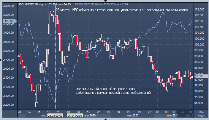 В целом ситуация очень напоминает то, что происходило в апреле и мае: тогда инвесторы воочию увидели последствия локдауна, но американская валюта не смогла вернуться к мартовским пикам — индекс доллара провел это время в «боковике», а когда обстановка начала улучшаться, быстро пробил его нижнюю границу.