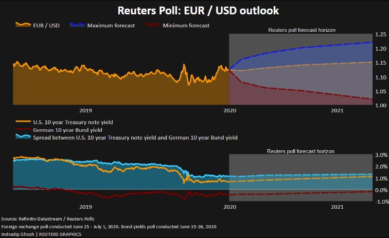 Начиная с 1 июня более 70 аналитиков, участвовавших в опросе, высказались о слабых перспективах доллара США. И тому есть свое объяснение: главный медицинский эксперт США спрогнозировал дальнейшее распространение коронавируса, в то время как председатель ФРС Джером Пауэлл в понедельник подтвердил, что экономические перспективы крупнейшей экономики мира были неопределенными.