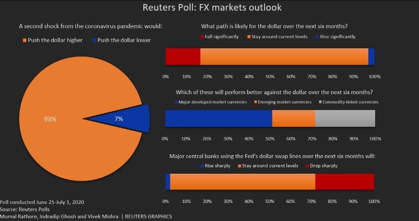 Но более 90%, или 63 из 68, заявили, что второй шок от пандемии подтолкнет доллар вверх. Пятеро сказали, что это подтолкнет американскую валюту вниз.