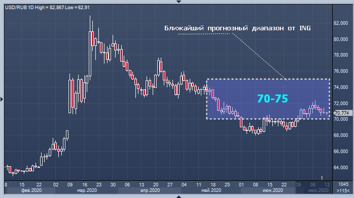 Аналитик ING Дмитрий Долгин в сегодняшнем утреннем обзоре напомнил, что имеет весьма сдержанный прогноз по российскому рублю: диапазон колебаний курса рубля к доллару США на ближайшую перспективу составит 70-75/$, а в конце года курс отечественной валюты будет находиться на уровне 72/$.