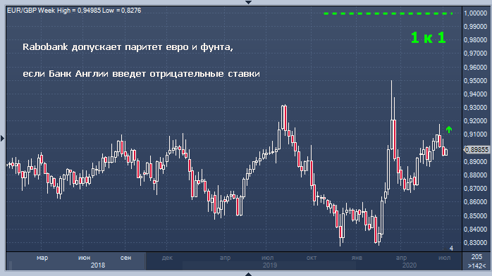Фунт может упасть до паритета с евро, если Банк Англии снизит процентные ставки ниже нуля, а Великобритания не сможет договориться о торговой сделке с ЕС, говорит Rabobank.