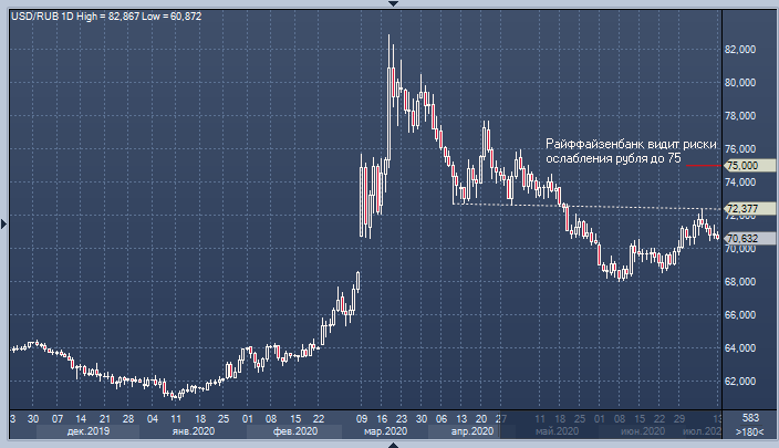 Райффайзенбанка предупреждает о риске роста USDRUB к отметке в 75 рублей за доллар. В банке обращают внимание на перспективы снижения профицита текущего счёта в третьем квартале до всего лишь $1.3 млрд. Этого недостаточно, чтобы компенсировать по-прежнему высокий объём вывоза капитала в условиях, когда приток средств нерезидентов в облигации федерального займа упал почти до нуля.