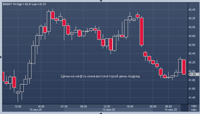 Цены на нефть снижаются второй день подряд на фоне ухудшения отношений между США и Китаем, а также на ожиданиях скорого смягчения ограничений на добычу в рамках ОПЕК+. Вчера Белый дом назвал незаконными претензии Китая на офшорные ресурсы большей части Южно-Китайского моря, что оказало некоторое давление на рискованные активы, включая нефть. Непосредственные последствия этого события пока остаются неясными, однако эскалация напряженности между Вашингтоном и Пекином может замедлить восстановление мировой экономики от коронавируса.